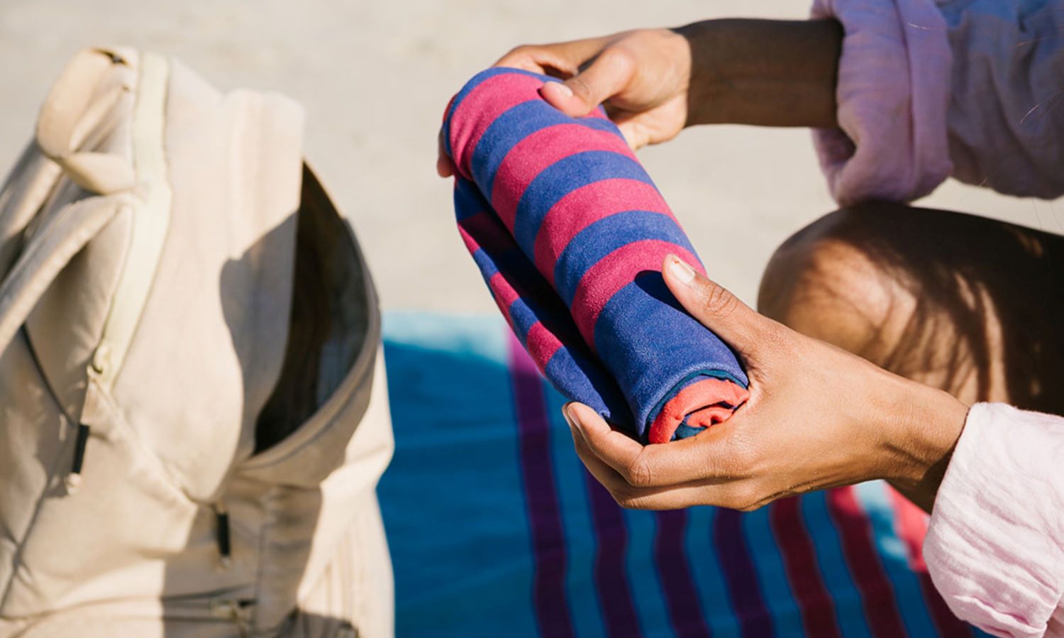The lightweight, packable design means it folds down to a fraction of the size of a traditional cotton towel, making it an easy-storing solution for backpacks, beach totes, and gym bags. When it’s laundry day, machine wash on warm, tumble low, or hang to dry.